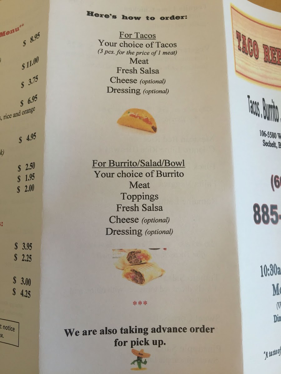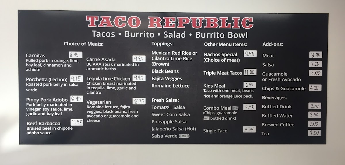Welcome to Taco Republic, your go-to spot for vibrant, flavorful tacos and burritos in Sechelt, BC. Nestled conveniently at 106-5580 Wharf Ave, Taco Republic offers an exciting menu that showcases a delightful array of meat options, including Carnitas, Beef Barbacoa, and the unique Pinoy Pork Adobo. For those who prefer vegetarian fare, there are equally tasty options available. Each dish is crafted with care, ensuring generous protein portions and robust flavors.